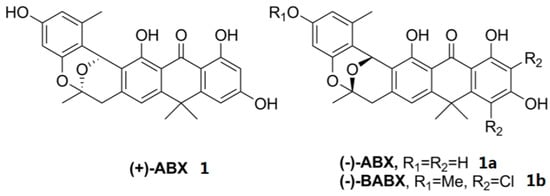 Anthrabenzoxocinones (ABXs) are a group of hexacyclic aromatic ketones with bioactivities, such as antibacterial activity [25,26,27], anti-hypertensive activity [28], cholesterol-reducing activity [27] and nuclear hormone receptors [25]. ABX family members such as (+)-anthrabenzoxocinone ((+)-ABX) (BE-24566B, also named 1.264C,1), (−)-anthrabenzoxocinone ((−)-ABX)(1a), as well as (−)-bischloroanthrabenzoxocinone ((−)-BABX)(1b), (Figure 1) have been isolated from Streptomyces sp. (MA6657), Streptomyces sp. FXJ1.264, or Streptomyces violaceusniger, and Actinomyces sp. MA7150, respectively [29].