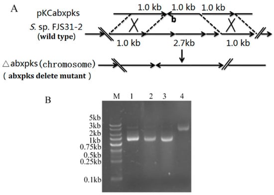 Deleted mutation of abxp, abxk, and abxs. (A) Mutation strategies of abxp, abxk, and abxs. (B) Analysis of abxp, abxk, and abxs deletion by PCR (lanes 1, 2, and 3: abxpks-deleted mutants; lane 4: wild-type strain; and M: DNA marker).