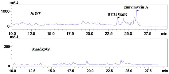 Wild-type Streptomyces sp. FJS 31-2 and its abxpks-deleted mutant strain (△abxpks) were fermented, isolated, and chemically prepared under the same conditions, followed by high-pressure liquid chromatography (HPLC) detection. The result of the metabolite profiling analysis showed that the mutant ceased to produce BE-24566B. However, BE-24566B was still detected in the wild-type strain; this finding confirms that abxp, abxk, and abxs are involved in the biosynthesis of BE-2456B (Figure 4).