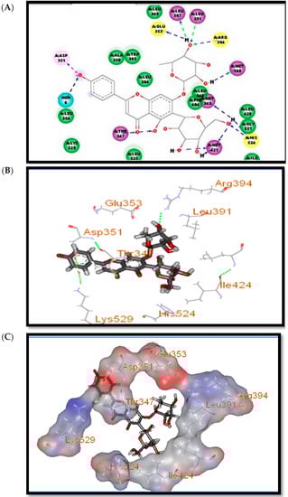 Binding mode for apigenin-7-O-rhamnosyl-6-C-glucoside on human estrogen receptor R. (A) 2D binding mode for apigenin-7-O-rhamnosyl-6-C-glucoside on human estrogen receptor R; (B) 3D binding mode for apigenin-7-O-rhamnosyl-6-C-glucoside on human estrogen receptor R; (C) apigenin-7-O-rhamnosyl-6-C-glucoside into the binding site surface of human estrogen receptor R.