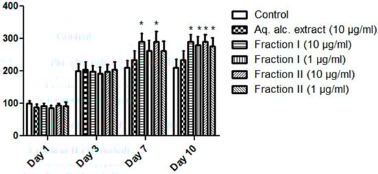 In this context, isolation of these alkaloids was not the scope of this work. The main objective was to evaluate the phytoestrogenic and cytoprotective activity of the plant extract. The aqueous methanol extract showed nontoxic effect on the tested cells, even in a high concentration. This can be attributed to the presence of only a low amount of the alkaloids for a solubility reason. However, the relatively higher cytotoxicity of the fractions may be attributed to the presence of other secondary metabolites, especially pterocarpan. These compounds showed potent inhibitory activity on protein-tyrosine phosphatase-1B, which is involved in many phosphorylation processes associated with cell growth and mitotic division []. Therefore, we selected the aqueous methanol extract together with fractions I and II for MCF-7 proliferation studies. The aqueous methanol extract (10 µg/mL) resulted in enhanced proliferation for MCF-7 cells. Sub-cytotoxic concentrations of fractions I and II (1 and 10 µg/mL) showed significant increases in the proliferation rate of MCF-7 cells at day 7 and day 10 (Table 3 and Figure 4). These results further support the phytoestrogenic activity evidenced by the Arabidopsis thaliana pER8: GUS reporter assay elaborated above.