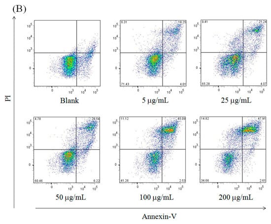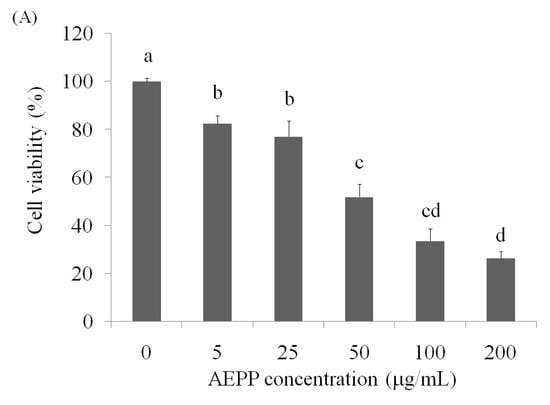 For detecting apoptosis, floating and adherent cells in the medium were collected after AEPP treatment. Cells were harvested, washed in ice-cold PBS, and resuspended in 200 μL of binding buffer before being incubated in 5 μL of annexin-V-FITC (BD Biosciences, SanDiego, CA, USA) solution and 5 μL of PI at temperature for 15 min in the dark. Subsequently, 300 μL of a binding buffer was added. Cells were analyzed through flow cytometry. Untreated cells were used as double staining controls.