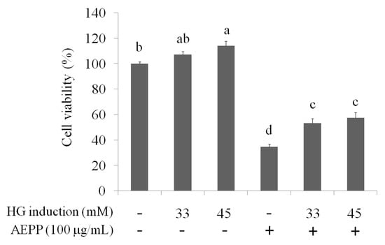 The suppression of AEPP on OVCAR-3 ovarian carcinoma cells induced by high glucose (HG). Data were shown as mean ± SD (n = 3). Different letters indicate a significant difference between groups (p < 0.05).