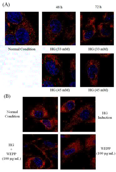 Metabolic syndromes are associated with ovarian cancer invasion and development. Here, the effects of AEPP on activation of mitochondrial functon and EMT caused by high-glucose (HG) induction were evaluated. As shown in Figure 2, HG (33 mM and 45 mM) treatment increased cell viability in OVCAR-3 cells compared to the control group. In contrast, the inhibitory effects of AEPP on the cell viability were attenuated in HG-treated OVCAR-3 cells. These results revealed that HG induction can regulate the energy balance and mitochondrial function, resulting in resistance of OVCAR-3 cells against AEPP-induced cell death. Subsequently, the mitochondrial morphology was observed by MitoTracker Deep Red FM staining. Fission and fusion are essential for cell growth, mitochondrial redistribution, and healthy mitochondrial network maintenance. In addition, mitochondrial fission and fusion have prominent roles in disease-related processes such as apoptosis and mitophagy. Mitochondrial fusion (or a mitochondrial network) was markedly observed in both 33 mM and 45 mM HG-induced OVCAR-3 cells after 48 h and 72 h treatment (Figure 3A). Mitochondrial activity in OVCAR-3 cells was attenuated through AEPP (100 μg/mL) treatment resulting in mitochondrial fission (Figure 3B). Taken together, AEPP can inhibit OVCAR-3 cells probably through suppression of mitochondrial activity, but this potential was attenuated by HG treatment.