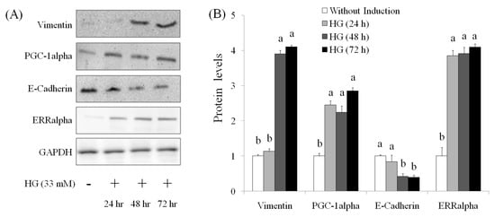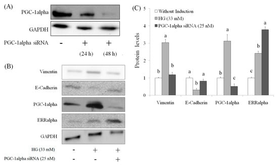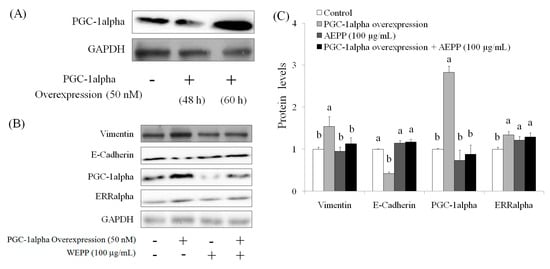 The suppression of PGC-1alpha level was found in OVCAR-3 cells (with or without HG induction) by AEPP treatment. Therefore, the role of PGC-1alpha during EMT in HG-induced OVCAR-3 cells treated by AEPP was evaluated. First, small-interfering RNA (siRNA; 48 h) was used for inhibition of PGC-1alpha (Figure 6A). The results indicated that PGC-1alpha knockdown markedly suppressed the elevation of vimentin expression and recovered the expression of E-cadherin level in HG-induced OVCAR-3 cells. However PGC-1alpha knockdown did not affect ERRalphain HG-induced OVCAR-3 cells (Figure 6B,C). These results revealed that the loss of PGC-1alpha attenuates EMT—including promotion of vimentin and loss of E-cadherin caused by HG induction in OVCAR-3 cells—and these results were similar to that caused by AEPP treatment. In addition, these effects were confirmed by PGC-1alpha overexpression (similar to HG induction) in OVCAR-3 cells. The results are shown in Figure 7. We observed that PGC-1alpha, vimentin, and ERRalpha levels were significantly elevated after 60-h induction in OVCAR-3 cells; however, this promotion of PGC-1alpha was inhibited through AEPP treatment. Similarly, AEPP treatment inhibited vimentin and elevated E-cadherin levels through suppression of PGC-1alpha in OVCAR-3 cells (Figure 8).
