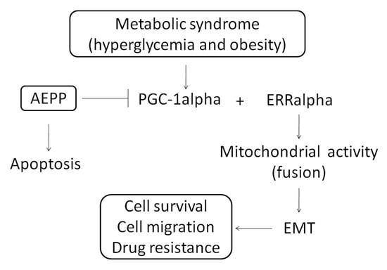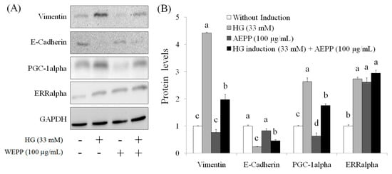 EMT is a main mechanism of cancer metastasis [21,22]. By undergoing EMT, cancer cells maximize their growth, migration, invasion, metastasis, and drug resistance [23,24]. Therefore, EMT reversal is a potential therapeutic method for suppression of metastasis and chemotherapy resistance [24]. Mitochondrial biogenesis requires coordinated nuclear and mitochondrial DNA expression; the signaling pathways that coordinate the transcription and replication signaling pathways between genomic and mitochondrial DNA require further elucidation. PGC-1alpha plays a key role in mitochondrial biogenesis. PGC-1alpha cooperates with ERRalpha to promote the expressions of multiple nuclear-encoded genes associated with mitochondrial fusion [25]. The levels of vimentin, PGC-1alpha, and ERRalpha were elevated in OVCAR-3 cells treated by HG for 24 h–72 h, but the level of E-cadherin was descreased in HG-induced OVCAR-3 cells (Figure 4). These results suggested that HG induction significantly resulted in EMT in OVCAR-3 cells. By contrast, we observed that AEPP (100 μg/mL) markedly attenuated HG-induced elevations of vimentin and PGC-1alpha levels in OVCAR-3 cells; however, these effects of AEPP were attenuated by HG induction. However, treatment of AEPP did not affect ERRalpha expression in HG-induced OVCAR-3 cells (Figure 5).