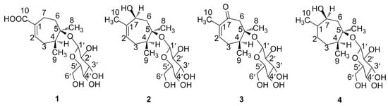 The genus Magnolia (family Magnoliaceae) includes about 90 species worldwide, mainly distributed in tropical and temperate regions of Asia and North America to South America. In China, there are about 30 species, mostly distributed in the southern and northern provinces of China [1]. Flos Magnoliae, the flower buds of M. biondii, M. denudata or M. sprengeri, which is unique to China and mostly distributed in the Henan, Hubei, Zhejiang, Anhui, and Shanxi provinces, has been used as a traditional Chinese medicine for more than 1500 years to treat nasal congestion, headaches, sinusitis, and allergic rhinitis [2,3,4]. Its volatile oil has also been processed into all kinds of cosmetics which are widely used in China [4]. It has been reported to possess extensive anti-allergy [5,6], anti-inflammatory [7], anti-angiogenic [8], anti-platelet aggregation [9,10], antimicrobial [11] and antioxidant activities [12,13]. Several types of compounds have been isolated from the plant, including lignans [9], neolignans [9], sesquiterpenoids [14], alkaloids [15,16], and flavonoids [15,16]. In order to further investigate the active components of the herb, a systematic phytochemical study was carried out on the 50% aqueous acetone extract of flower buds of Magnolia biondii. As a result, four new monoterpenoid glycosides1–4, named magnoliaterpenoid A–D (Figure 1), were isolated and structurally identified, along with a known sesquiterpenoid glycoside, (1′R,3′S,5′R,8′S,2Z,4E)-dihydrophaseic acid 3-O-β-d-glucopyranoside (5). Herein, the isolation and structural elucidation of compounds 1–4 are reported, as well as their antimicrobial activity.