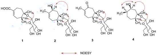 Key NOESY correlations of compounds 1–4.
