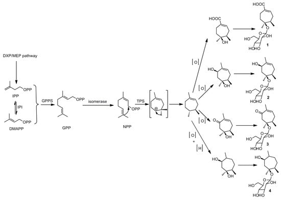 Since the aglycones of these four new compounds contained 10 carbon atoms and belonged to the monoterpenoid class of compounds, we propose a plausible biosynthetic route via the biogenetic isoprene rule, as shown in Scheme 1.