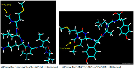 We synthesized two peptides (peptide “a” and peptide “b”) corresponding to subunit 4 and 6 of human mitochondrial NADH dehydrogenase, respectively. The formylated sequences act as chemoattractants for leukocytes, can trigger a dramatic increase in the phosphorylation levels of ERK1/2, and are able to change the cytosolic calcium concentration in promyelocytic HL-60 cell line, stably expressing either FPR1 or FPR2 [18]. The synthesis of peptide “a” is illustrated in Scheme 1. The protocol is based on the addition of a formylation group to the N-terminus of a peptidyl-resin followed by cleavage to obtain the final formylated peptides (Met1-Leu2-Lys3-Leu4-Ile5-Val6 (MH+ = 744 a.m.u.) and Met1-Met2-Tyr3-Ala4-Leu5-Phe6 (MH+ = 803 a.m.u.)) illustrated in Figure 1.