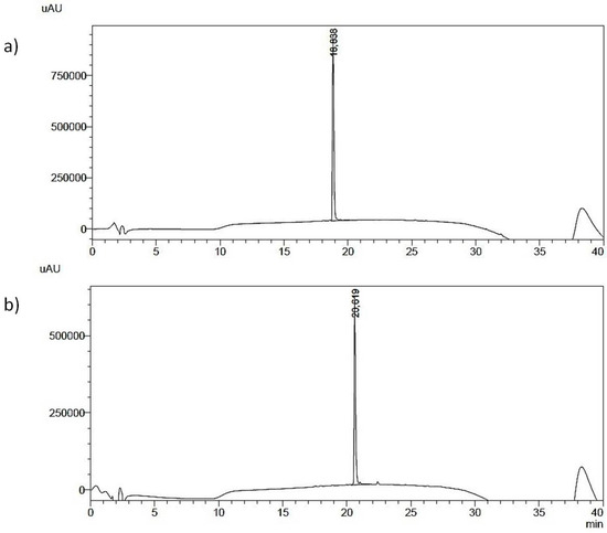The formylated peptides were synthesized using a standard Fmoc-based solid phase peptide synthesis [19,20]. In particular, the preloaded Fmoc-Val-PEG-PS resin was employed for peptide “a” and Fmoc-Phe-PEG-PS was employed for peptide “b”. The formylation reaction was performed after the complete assembly of the peptide chains on solid support by incubation with the formylating reagent obtained, in liquid phase, by mixing formic acid with DCC in diethyl ether at 0 °C. The formylating solution, filtered to remove the side product urea and concentrated by rotary evaporator, was added to the peptidyl-resins with DIPEA (diisopropylethylamine) in DMF (N,N-dimethylformamide). The reaction was carried out at 4 °C overnight. Low temperatures were important for preventing formic acid decomposition. The outcome of the N-formylation reaction was verified by the Kaiser test. The final step consisted in the cleavage of the formylated peptide from the solid support with an aqueous acidic solution containing TFA (trifluoroacetic acid) and the addition of TIS (triisopropylsilane) as scavengers to prevent by-product formation from electrophilic intermediates present in the cleavage process. The final products were obtained in good yield (70%–75%) and in high purity after RP-HPLC purification. The analyses by HPLC and MALDI-Tof of purified products are reported in Figure 2 and Figure 3, respectively.