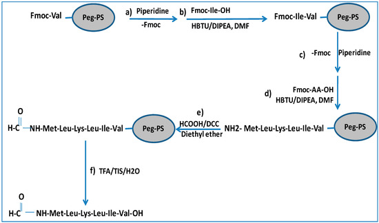 Synthesis of N-formylated peptide: (a) Fmoc deprotection of preloaded resin with the first amino acid (20% piperidine in N,N-dimethylformamide (DMF) for 10 min); (b) amino acid coupling (HBTU/Fmoc-AA-OH/DIPEA (4:4:8), reaction time 20 min); (c) Fmoc deprotection (as for step a); (d) amino acid coupling as for step (b) for all amino acids; (e) formylation of the peptidyl-resin by overnight incubation at 4 °C with a formylating reagent produced by incubation of formic acid and N,N-dicyclohexylcarbodiimmide (DCC) in diethyl ether at 0 °C for 4 h; (f) Cleavage of formylated peptides from the resin by 3 h incubation with a solution of TFA/TIS/H2O (95:5:5). See the Abbreviations section for definitions.