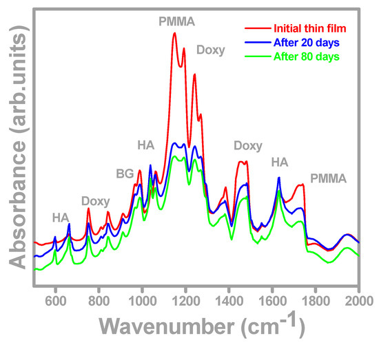 The FTIR spectra of the freshly prepared films and after 20 and 80 days of immersion in SBF are shown in Figure 3. The spectrum of the initial BG-PMMA-Doxy/SS film (red curve in Figure 3) displays peaks at 1008 and 982 cm−1 which correspond to BG. The peaks at 1732, 1244 and 1151 cm−1 are assigned to PMMA [46], while the ones at 1456, 1275 and 765 cm−1 are representative of Doxy [47]. After 20 and 80 days of immersion in SBF, one can notice significant changes in the FTIR spectrum: a lower amplitude of all peaks compared to the initial one (blue and green curves in Figure 3) together with the occurrence of new peaks at 1648, 1045 and 675 cm−1. These peaks belong to carbonated hydroxyapatite (CHA) which is similar to the main component of the bone [48,49].
