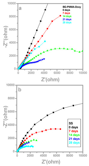 Nyquist diagrams for BG-PMMA-Doxy/SS sample (a) and bare SS sample (b) after 0 (black), 7 (red), 14 (green), 21 (blue) and 28 (cyan) days of immersion in SBF. The estimated standard deviation is 8.1%.