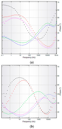 In case of BG-PMMA-Doxy/SS, the substrate is initially covered with a stable, near pure capacitive layer with a high polarization resistance and the corresponding Nyquist diagram (Figure 5a, black curve) is a semicircle with a very large radius, with −67° max phase angle. After 7 days of immersion in SBF, the radius of Nyquist plot slightly decreases (Figure 5a, red curve), while after 14 and 21 days, the Bode plots are characterized by two time constants. Correspondingly, each of them has two max phase angles: −43° and −24° after 14 days and −40° and −28°, after 21 days of immersion, respectively (Figure 6a and Table 2).