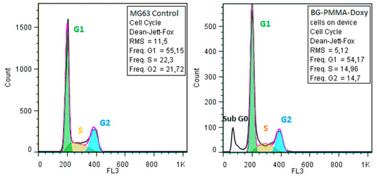 Flow cytometry diagrams of the cellular cycle of MG63 cells grown on BG-PMMA-Doxy thin films.