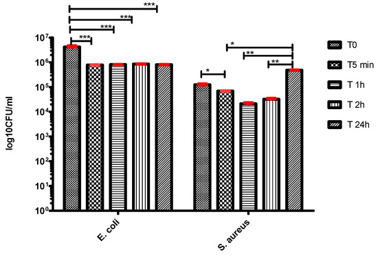 In case of E. coli, the microbial growth was inhibited during the entire duration of the experiment, while in case of S. aureus, the initial slight decrease of the VCCs observed after 5 min contact, was followed by a more significant one after 1 h of contact, followed by a slight increase after 2 h and an exponential growth till 24 h (Figure 9).