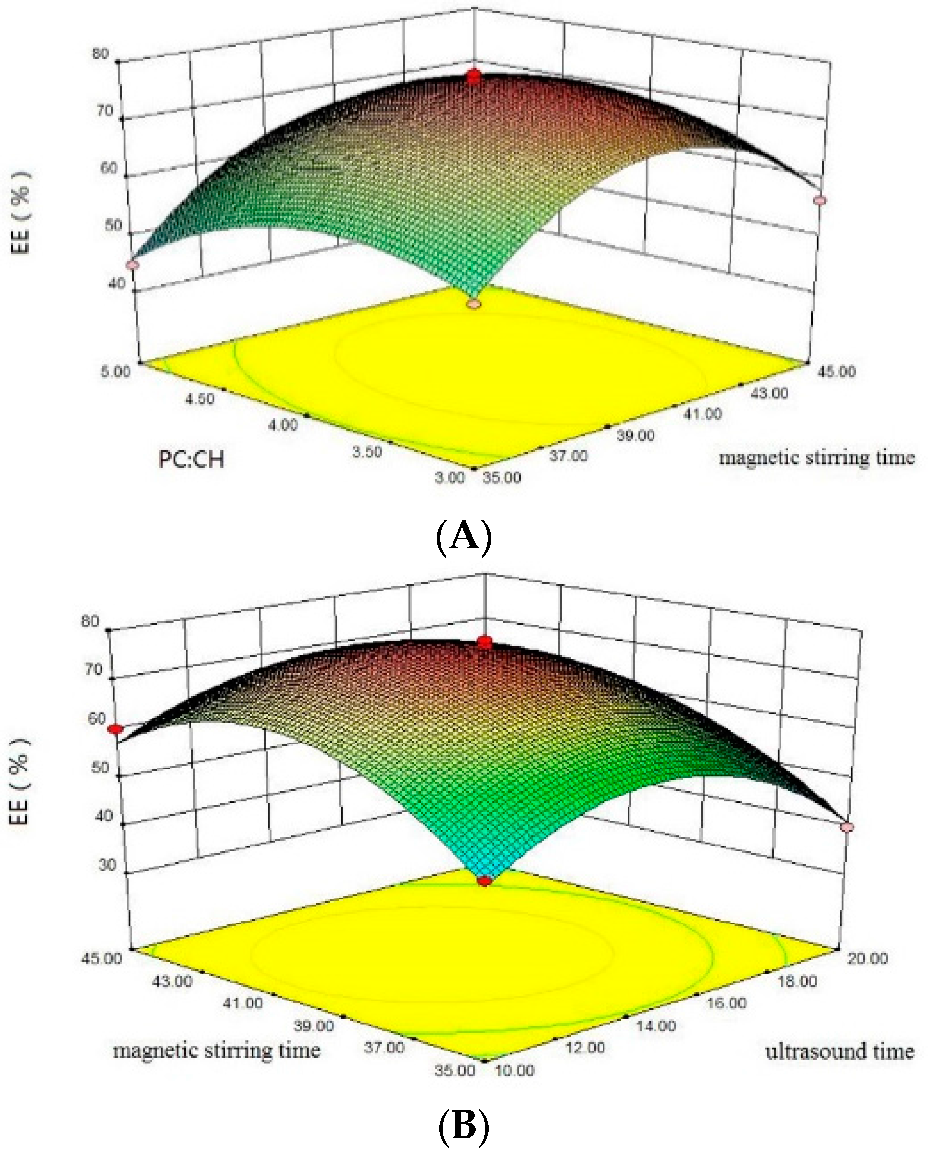 Response surface figures with the influence of the independent variables on encapsulation efficiency of lysozyme nanoliposomes. The effects of phosphatidylcholine-to-cholesterol ratio and magnetic stirring time are shown in (A) (ultrasound time = 15 min and lysozyme concentration = 2 mg/mL); the effects of magnetic stirring time and ultrasound time are shown in (B) (phosphatidylcholineto-cholesterol ratio = 4 and lysozyme concentration = 2 mg/mL).