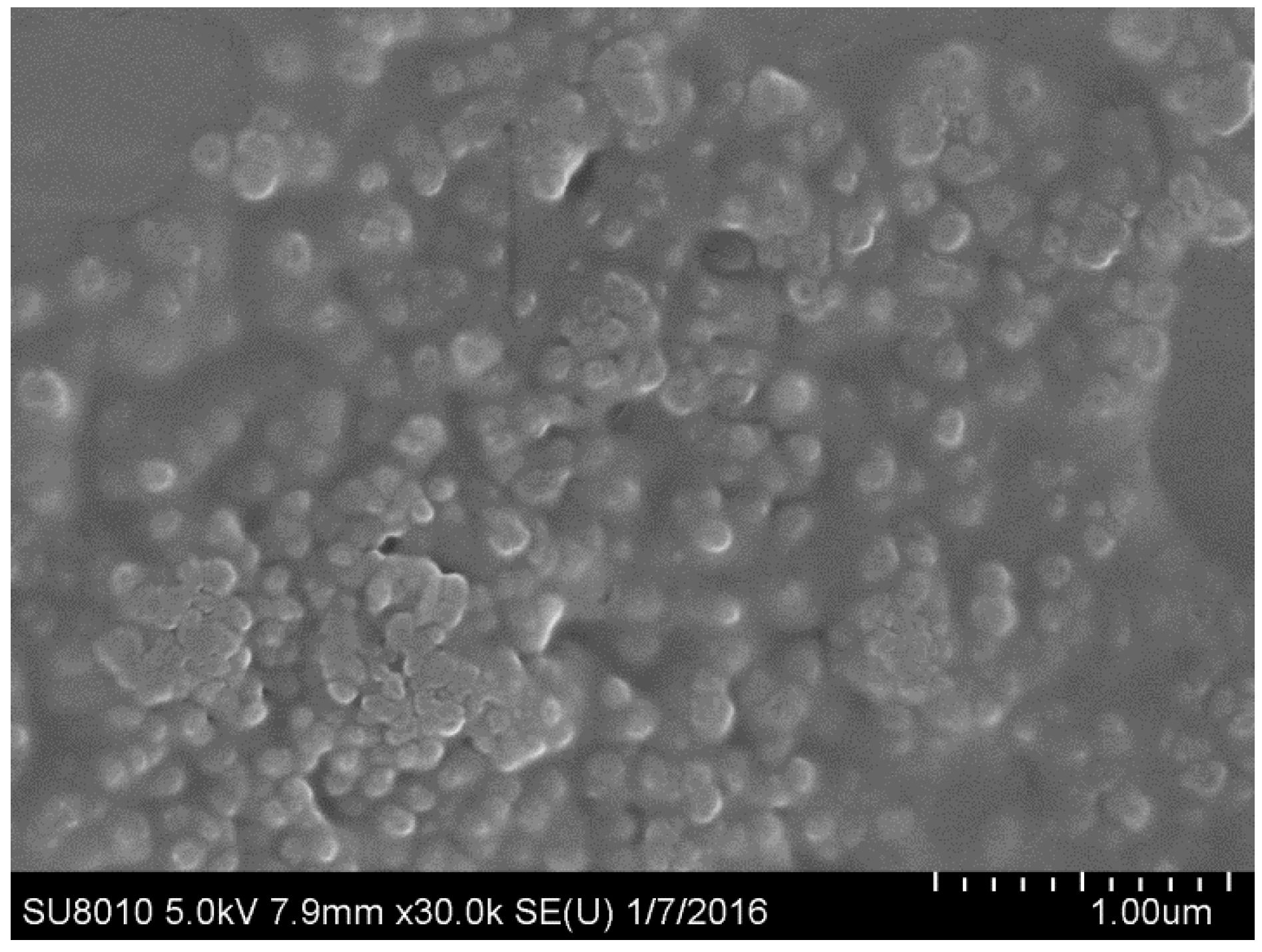 After the effects of lysozyme concentration, PC/CH, ultrasound time, and magnetic stirring time on the preparation of lysozyme nanoliposomes were studied, the optimum ranges for each independent variable were determined in order to prepare lysozyme nanoliposomes with the highest EE. The optimum preparation conditions were as follows: phosphatidylcholineto-cholesterol ratio of 3.86, lysozyme concentration of 1.96 mg/mL, ultrasound time of 14.15 min, and magnetic stirring time of 40.61 min. The conditions provided the highest encapsulation efficiency (77%), and the experimental values had a good agreement with the predicted values, which showed that the optimized conditions of preparation were very reliable. Optimized lysozyme nanoliposomes were used for the measurement of particle size distribution (Figure 2). At this optimum point, particle size was found to be 245.6 nm ± 5.2 nm. The results indicated that the optimized liposomes were in the nanoscale. Scanning electron micrographs revealed that the produced lysozyme nanoliposomes had a regular spherical shape and formed and agglomerated in a fully spread manner (Figure 3). SEM analysis (Figure 3) showed that the particle size of the prepared nanoliposomes was approximately 250 nm.