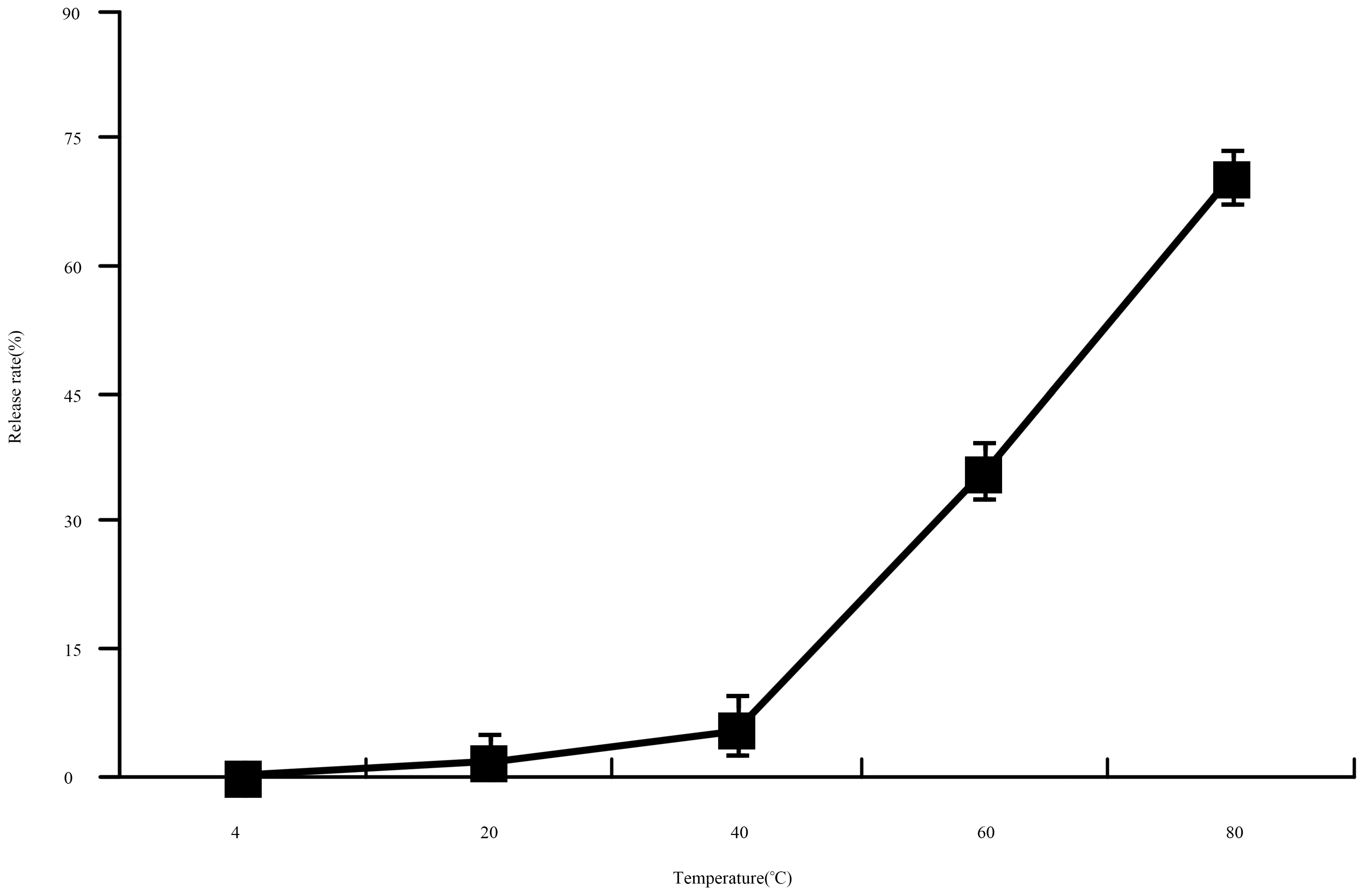 The thermal stability of lysozyme nanoliposomes was evaluated at five different temperatures (4, 20, 40, 60, and 80 °C) at the same pH value (pH 6.8). After 30 min, lysozyme nanoliposomes were taken out and the encapsulation efficiency of each sample was measured. The release ratios were obtained via Equation (4).