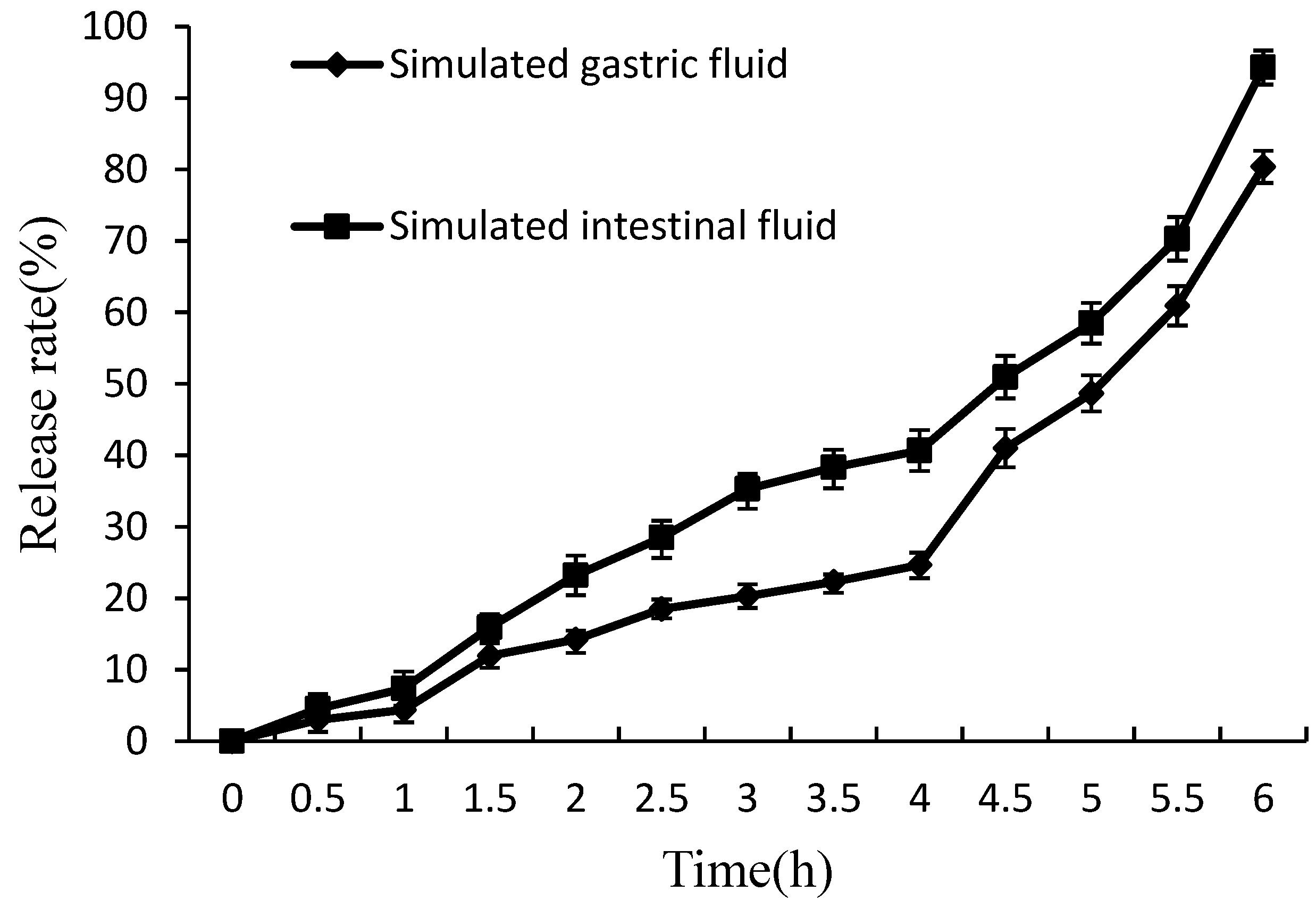 SGF and SIF were prepared according to a previous study [33]. SGF was composed of hydrochloric acid (0.10 M), pepsin and deionized water. The pH value of SGF reached 1.3 via hydrochloric acid (0.10 M). SIF was composed of sodium hydroxide (0.10 M), potassium dihydrogen phosphate (6.8 mg/mL), deionized water and trypsin (10 mg/mL). The pH reached 7.5 by using sodium hydroxide (0.10 M). A certain amount of lysozyme liposomal samples (15 mL) was mixed with the equal volume of SGF or SIF in a 100 mL shaker, and then placed on in a shaking table which is 150 rpm and 37 °C. Every half hour until 6 h, an aliquot of the mixture was taken out of the 100 mL shaker, and placed in a 10 mL tube. The release of lysozyme from nanoliposomes was indicated by release ratio. Each experiment was carried out in three parallel experiments, and average values were obtained. The release rate was obtained via Equation (5).