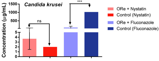 Minimum inhibitory concentration of nystatin and fluconazole in the presence and absence of R. echinus leaf essential oil for Candida krusei. ORe = R. echinus leaf essential oil. Statistical analysis: one-way ANOVA followed by Bonferroni post-hoc test. *** p < 0.001 indicates significant difference when R. echinus leaf essential oil was added to the medium. ns, not significant. Data show mean + SEM from three independent experiments performed in triplicate.