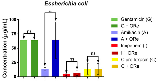 Minimum inhibitory concentration of antibiotics in the presence and absence of R. echinus leaf essential oil for Escherichia coli. ORe = R. echinus leaf essential oil. Statistical analysis: one-way ANOVA followed by Bonferroni post-hoc test. ** p < 0.01 indicates significant difference when R. echinus leaf essential oil was added to the medium. ns, not significant; G = gentamicin, A = amikacin, I = imipenem, C = ciprofloxacin. Data show mean + SEM from three independent experiments performed in triplicate.