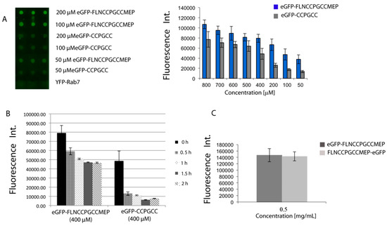 Cloning, expression and purification of tetracysteine-fused EGFP proteins was performed by the Dortmund Protein Facility. To generate the tetracysteine-fused EGFP proteins, the oligonucleotides 5′-CTGTTGCCCGGGCTGCTGTTA-3′/5′-AGCTTAACAGCAGCCCGGGCAACAGGTAC-3′ and 5′-CTTTCTGAACTGCTGCCCGGGCTGCTGCATGGAACCGTA-3′/5′-AGCTTACGGTTCCATGCAG CAGCCCGGGCAGCAGTTCAGAAAGGTAC-3′ (for N-terminal fusion to the EGFP sequence) and 5′-CATGGCATGTTGCCCGGGCTGCTGTCCA-3′/5′-AGCTTGGACAGCAGCCCGGGCAACAT GC-3′ and 5′-CATGGCATTTCTGAACTGCTGCCCGGGCTGCTGCATGGAACCGCCA-3′/5′-AGCT TGGCGGTTCCATGCAGCAGCCCGGGCAGCAGTTCAGAAATGC-3′ (for C-terminal fusion to the EGFP sequence) were hybridized and ligated into KpnI/HindIII or NcoI/HindIII restricted pOPIN(c/n)EGFP plasmids. Proteins were expressed in BL21 (DE3) RIL cells in TB medium after induction by IPTG at 20 °C overnight for pOPIN-CCPGCC-EGFP or after autoinduction at 20 °C overnight for pOPIN-EGFP-CCPGCC, pOPIN-FLNCCPGCCMEP-EGFP. Proteins were purified by means of Ni-sepharose affinity chromatography followed by size-exclusion chromatography. Proteins were stored in 25 mM of HEPES, 40 mM NaCl, 1 mM TCEP, pH 7.2 and the immobilization of the purified TC proteins was carried out as described before. To verify the site-specific immobilization of proteins, an YFP-tagged Rab7 lacking the TC sequence was also spotted onto the slide as negative control. Protein samples were spotted at different concentrations and incubated for one h. Then the slide was washed three times for 5 min with Tris buffer, Tris buffer containing 0.05% Tween-20, rinsed with Milli-Q water, dried under argon and protein immobilization was measured by fluorescence scanning (eGFP fluorescence signal (ex.: 484 nm, em.: 507 nm).