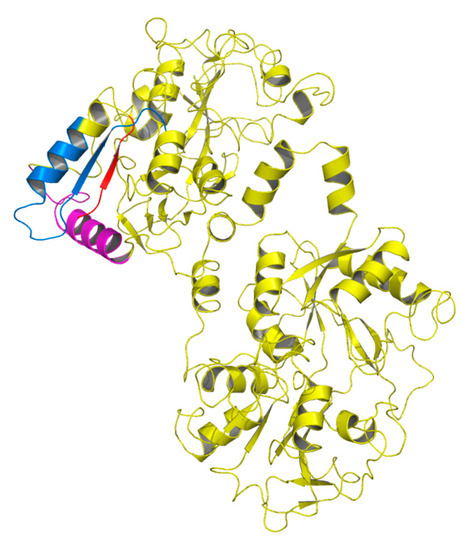 Overall structure of lactoferrin showing positions of the functional peptides Lf(1–11) (red), lactoferrampin (pink), and lactoferricin (blue) in the N-terminal lobe.