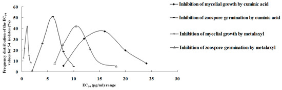 Frequency distributions of EC50 values of 54 P. capsici isolates for cuminic acid and metalaxyl for inhibition of mycelial growth and zoospore germination, respectively.