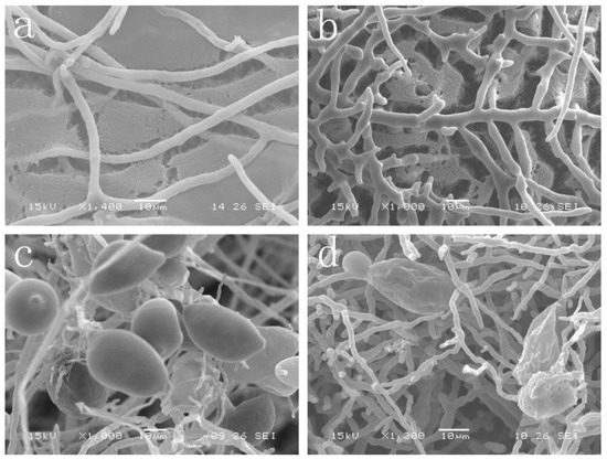 The ultrastructure of P. capsici mycelia treated with cuminic acid was observed by SEM. After treatment with cuminic acid, mycelia were severely deformed, displaying excessive branching. Moreover, the surface of mycelia had numerous protuberances and intensive hyphal tops, while untreated plates appeared natural (Figure 3a,b). In addition, formation of sporangia by P. capsici was natural when plates were not treated with cuminic acid; whereas, sporangium formation by P. capsici was significantly influenced by cuminic acid at 20 μg/mL (Figure 3c,d).