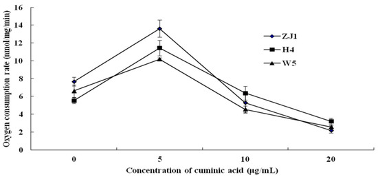 Effect of different concentrations of cuminic acid on mycelial respiration of three P. capsici isolates ZJ1, H4, and W5. Values are means and standard errors.