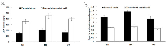 When treated with cuminic acid, the DNA contents of the three isolates ZJ1, H4, W5 were significantly higher than that of the control (Figure 6a). In contrast with DNA content, pyruvic acid contents of the three isolates ZJ1, H4, W5 treated with cuminic acid were different from the control, and were reduced by 42.4%, 49.68%, and 41.88%, respectively (Figure 6b).
