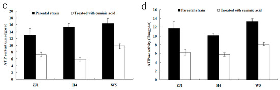 ATP is the direct source and a classical indicator of energy needed by all life organisms in vivo. Moreover, ATPase activity is a critical indictor of the rate of energy utilization [31]. After treatment with cuminic acid, ATP contents were significantly lower than that of the control (Figure 6c). As showed in Figure 6d, ATPase activities of the three isolates ZJ1, H4, W5 treatment with cuminic acid were significantly lower than that of the control. These data suggested that cuminic acid could not only decrease the activity of ATPase, but also inhibit the energy production in P. capsici.