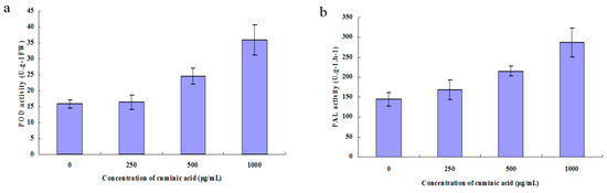 There was no significant change in the activity of POD and PAL when treated with cuminic acid at low concentration. With the increased concentration of cuminic acid, POD and PAL activities increased markedly (Figure 8).