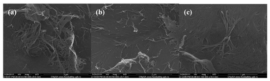 Scanning electron microscopy (SEM) images of chitin-sodium alginate composites: (a,b) 50,000×; (c) 100,000×.