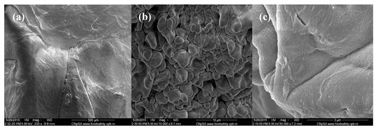 SEM images of Cefuroxime-loaded chitin-sodium alginate composites: (a) 200×; (b) 10,000×; (c) 40,000×.