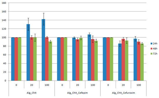 For the 24 h treatment with chitin-sodium alginate samples extract, the L929 fibroblasts showed an accelerated metabolic processing of the tetrazolium salt, thereby suggesting an increased proliferation of the cells, with about 40% for the undiluted suspension (compared to controls). After 48 h of experimental treatment, the viability was maintained at about the same level with the control samples, while at 72 h a slight reduction of the cellular viability was noticed. Regarding the Cefepime-loaded biocomposite samples, we also observed a small proliferation effect at 24 h after the treatment, while the reported data for both 48 h and 72 h treatments are similar to pristine polysaccharide composites. However, for the Cefuroxime experimental version, the reported cellular viability was reduced by about 8% for the diluted suspension at 24 h after the treatment, reaching a maximum at 48 h, after which a decrease of 1%–2% was registered. For the undiluted suspension, the viability decreased with time. However, for all samples, dilutions, and time intervals, the viability was maintained above 80%, meaning that the samples are biocompatible (according to ISO 10993-12:2001(E) [62]).