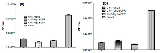 The in vitro evaluation of antimicrobial potential of antibiotic-composite samples was performed against E. coli and S. aureus bacterial strains (Figure 7). As one can observe, the pristine composites exhibited significant anti-bacterial effects against bacterial biofilm development, the reported colony forming units (CFU) in both experimental conditions being reduced with almost one and a half order of magnitude (when compared to control data). Regarding the Gram-negative strain, both antibiotic-loaded samples induced a decrease of viable biofilm-embedded cells, as revealed by the reported CFU/mL, which was lower than those obtained for the pristine material. On the other hand, for the Gram-positive cocci, the number of CFU/mL increased on the Cefuroxime-loaded composites when compared to the pristine chitin-sodium alginate samples, while the Cefepime-loaded composites showed significantly reduced values of CFU/mL. These unexpected results regarding Cefuroxime-loaded composites, taking into account that a methilicin susceptible S. aureus strain was used, could be explained by the fact that the amount of cefuroxime loaded in the wound dressing was inferior to the minimal required dose to eradicate the S. aureus biofilm. It is well known that S. aureus strains produce a biofilm-associated capsular polysaccharide adhesion PIA (polysaccharide intercellular adhesin) which protects the cells against antibiotics, thus requiring higher eradicating doses [63].