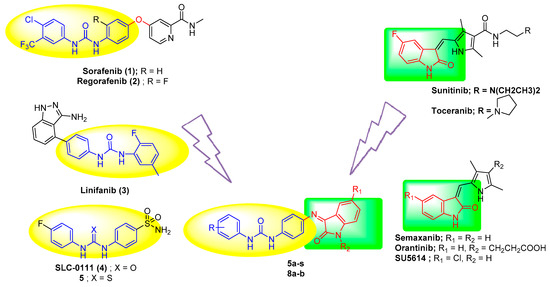 Biphenylurea derivatives and indolinone derivatives as anticancer agents and the proposed structures 5a–s and 8a,b.