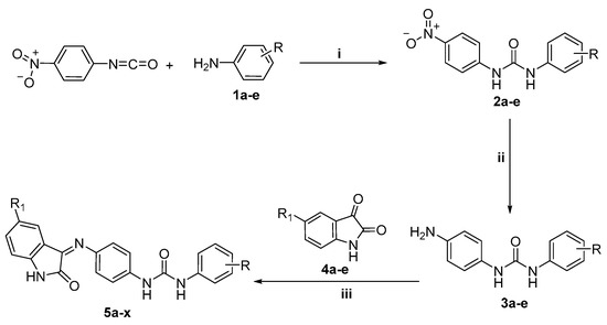 The synthetic pathway adopted to synthesize the target indolinone derivatives is outlined in Scheme 1 and Scheme 2. Synthesis was initiated by reacting 4-nitrophenyl isocyanate with the appropriate anilines 1a-e to afford 1-(4-nitrophenyl)-3-phenylureas 2a–e, followed by hydrogenation using Pd/C in methanol to furnish the corresponding amines 3a–e. The target indolinone derivatives 5a–x were obtained in good yields (75%–81%) through the condensation of the amino intermediates 3a–e with indole-2,3-diones 4a–e in ethyl alcohol in the presence of a catalytic amount of glacial acetic acid reaction (Scheme 1).