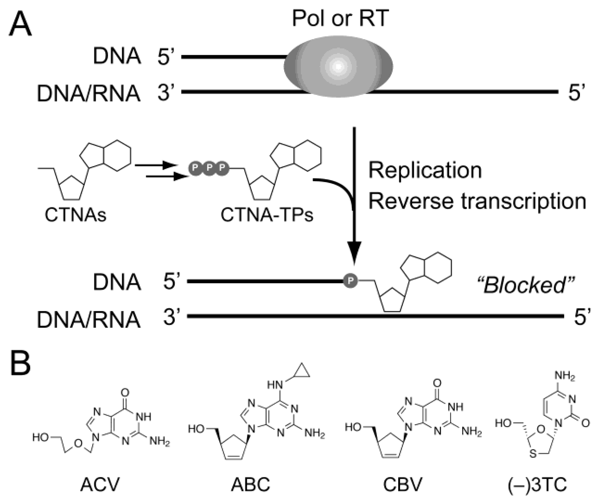 Chain-terminating nucleoside analogs (CTNAs). (A) Mechanism of the antiviral effect by the CTNAs; (B) The structures of the CTNAs used in this study.