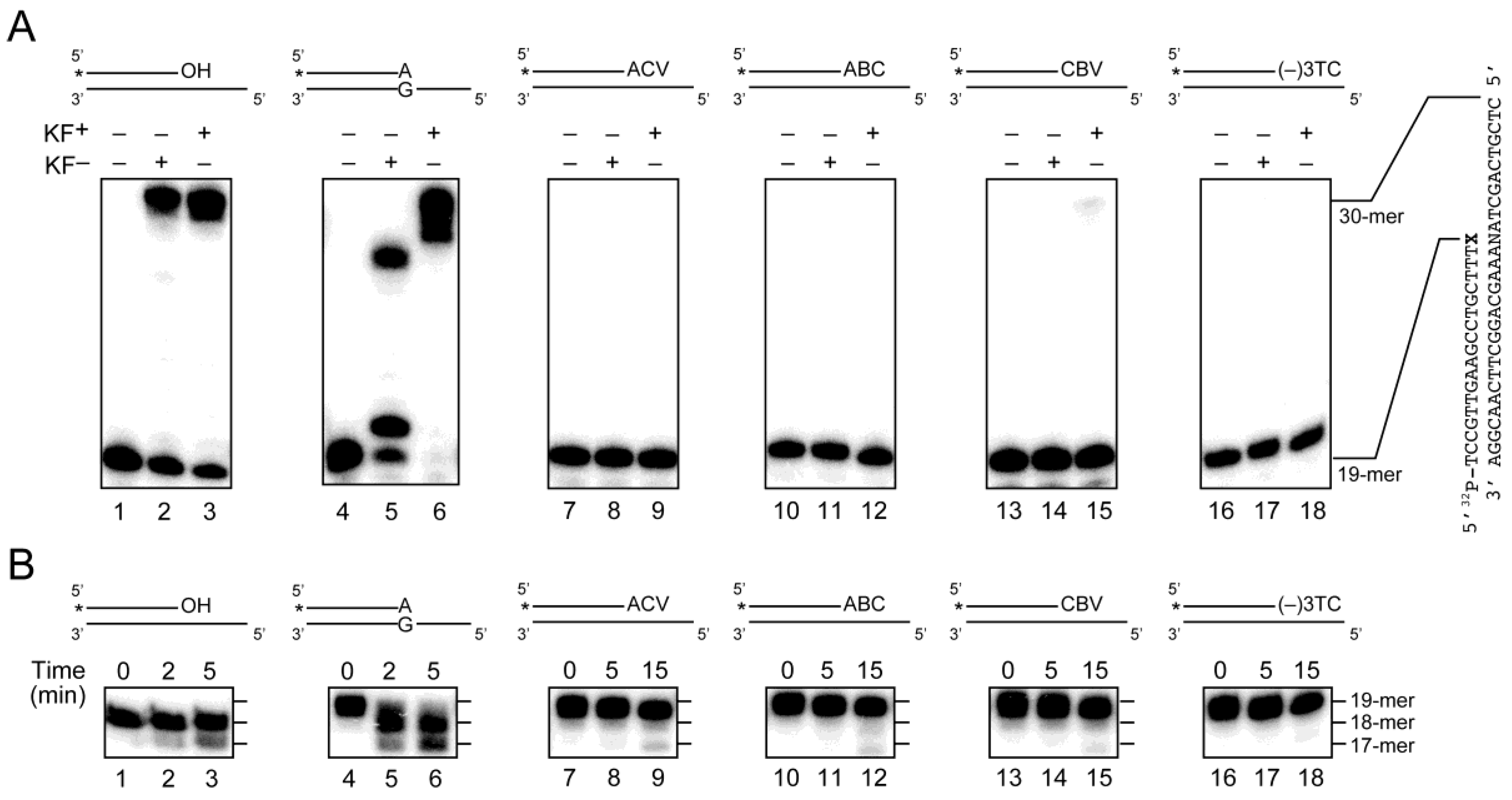 Primer extension from the CTNA-blocked termini by the Klenow fragment of Escherichia coli DNA polymerase I, with or without its proofreading 3′–5′ exonuclease activity (KF+ or KF−, respectively, from Takara Bio, Inc., Shiga, Japan), in the (A) presence or (B) absence of dNTPs. (A) The 32P-labeled oligonucleotides, 32P-d(TCCGTTGAAGCCTGCTTT)X, where X represents no added nucleoside (OH, lanes 1–3), 2’-deoxyadenosine (lanes 4–6), acyclovir (ACV, lanes 7–9), abacavir (ABC, lanes 10–12), carbovir (CBV, lanes 13–15) or lamivudine ((−)3TC, lanes 16–18), were hybridized with their complementary strands, d(CTCGTCAGCTANAAAGCAGGCTTCAACGGA), where N represents A (for ABC and an oligonucleotide without CTNAs), G (for A and (−)3TC) or C (for ACV and CBV). Each substrate was incubated at 37 °C for 10 min, in the absence (lanes 1, 4, 7, 10, 13 and 16) or presence of KF− (0.1 unit, lanes 2, 5, 8, 11, 14 and 17) or KF+ (0.1 unit, lanes 3, 6, 9, 12, 15 and 18), in 10 mM Tris-HCl buffer (pH 7.9) containing 50 mM NaCl, 10 mM MgCl2, 10 mM DTT and 100 µM dNTPs; (B) The 32P-labeled substrates were incubated with KF+ at 37 °C for the indicated incubation time, in the same reaction buffer without dNTPs.