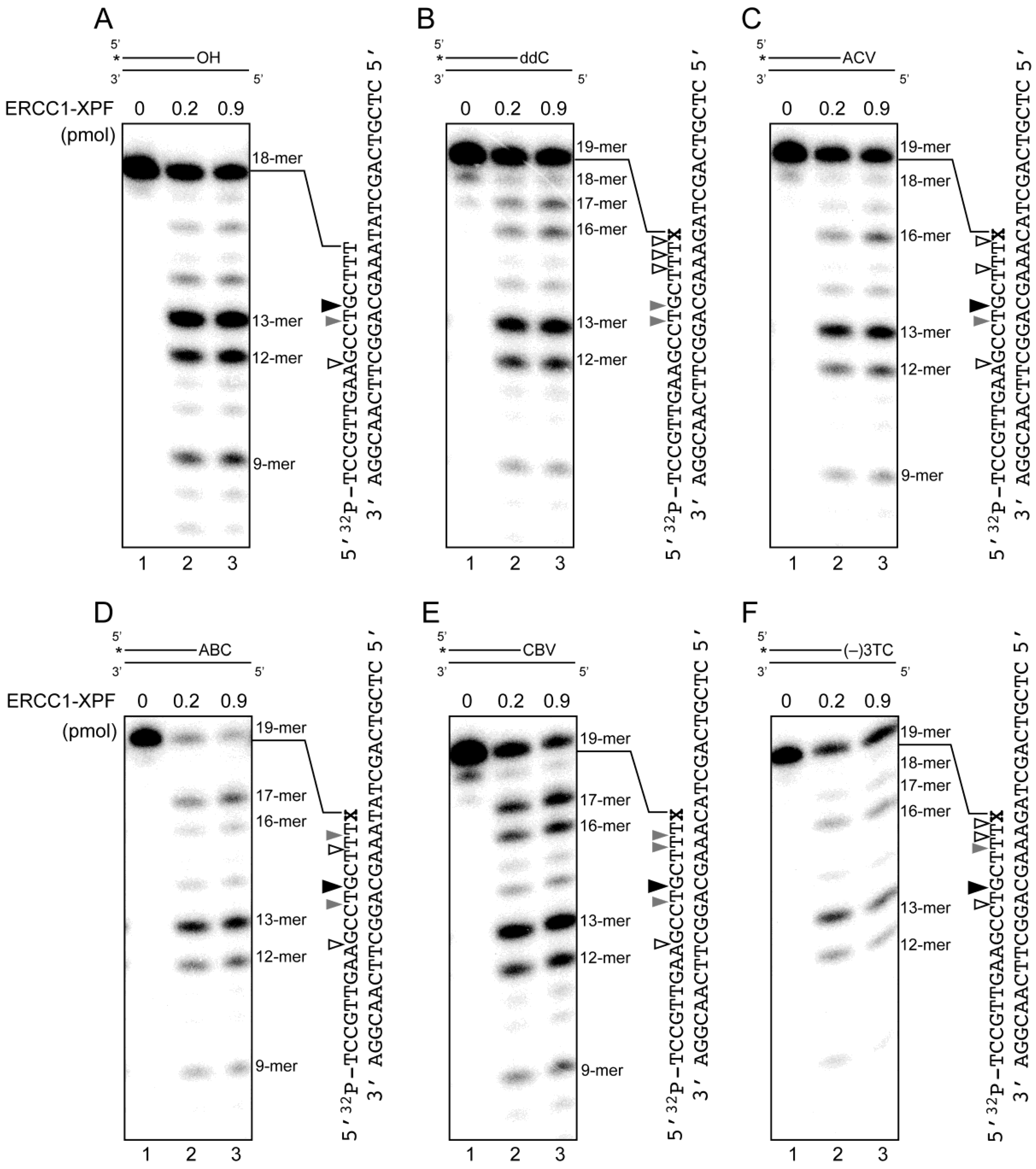 Removal of the CTNAs attached to the 3′-termini of oligonucleotides by human ERCC1-XPF endonuclease. The 32P-labeled substrates (400 fmol) containing (A) 3′-OH; (B) ddC; (C) ACV; (D) ABC; (E) CBV; and (F) (−)3TC were treated with increasing amounts of ERCC1-XPF (0, 230 and 920 fmol for lanes 1, 2 and 3, respectively) at 30 °C for 90 min, in 50 mM Tris-HCl buffer (pH 8.0) containing 0.5 mM MnCl2, 0.5 mM DTT and 0.1 mg·mL−1 bovine serum albumin (BSA). The cleaved products in lanes 3 were quantified, and the remarkable cleavage sites are indicated by black, gray and open triangles, depending on the yield of each product (>20%, 10%–20%, 5%–10%, respectively). The quantified values of the products are summarized in Table S2.
