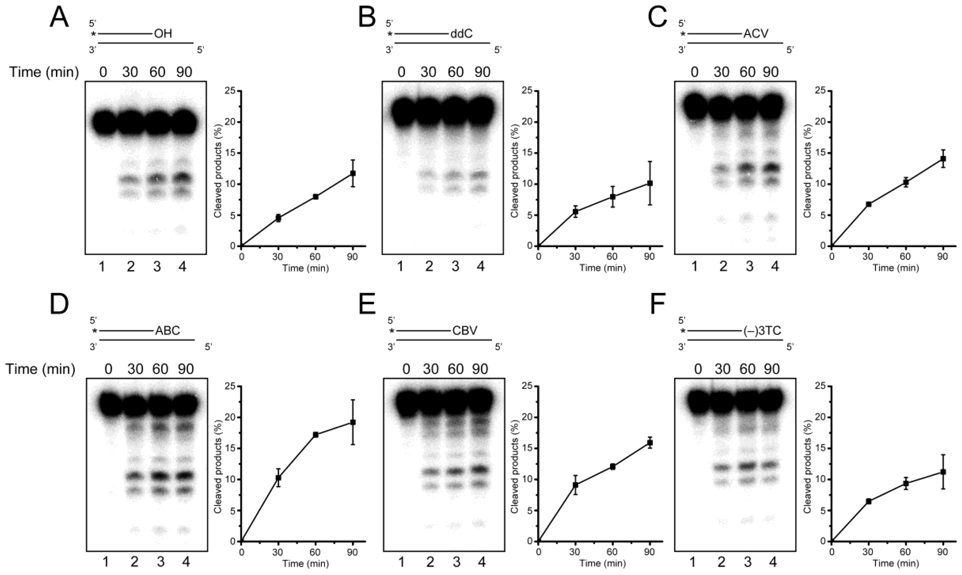 Time course of ERCC1-XPF cleavage. The 32P-labeled substrates (400 fmol) containing (A) 3′-OH; (B) ddC; (C) ACV; (D) ABC; (E) CBV; and (F) (−)3TC, were incubated at 30 °C for 0 (lanes 1), 30 (lanes 2), 60 (lanes 3) and 90 min (lanes 4), in the presence of ERCC1-XPF (92 fmol), in 10 µL of 50 mM Tris-HCl buffer (pH 8.0) containing 0.5 mM MnCl2, 0.5 mM DTT and 0.1 mg·mL−1 BSA. The experiments were performed in triplicate, and the increases in the amounts of the cleaved products shorter than the intact substrates were plotted. The data points are shown as mean ± SD.