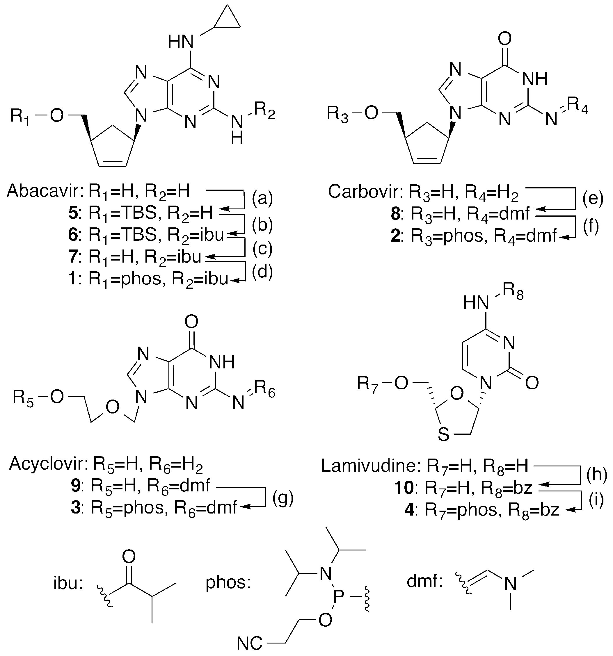 - Vince, R.; Hua, M. Synthesis of carbovir and abacavir from a carbocyclic precursor. In Current Protocols in Nucleic Acid Chemistry; John Wiley & Sons, Inc.: Hoboken, NJ, USA, 2006; Chapter 14, Unit 14.4. [Google Scholar]