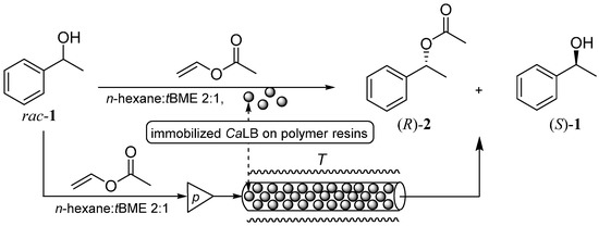 - Csajági, C.; Szatzker, G.; Tőke, E.R.; Ürge, L.; Darvas, F.; Poppe, L. Enantiomer selective acylation of racemic alcohols by lipases in continuous-flow bioreactors. Tetrahedron Asymmetry 2008, 19, 237–246. [Google Scholar] [CrossRef]