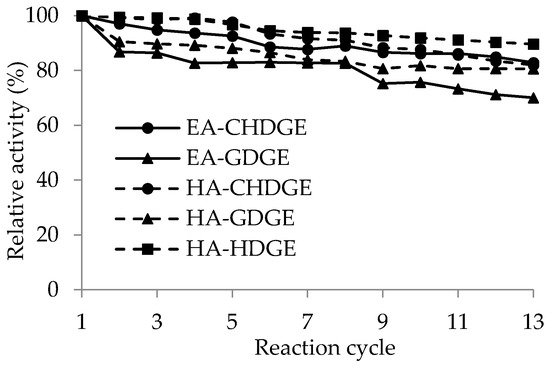 ) resin activated by CHDGE (●), GDGE (▲) or HDGE (■). Relative activity (%) = activity in given cycle/activity in first cycle × 100 was determined in kinetic resolution of rac-1. Experiments were performed as described in Section 3.9.