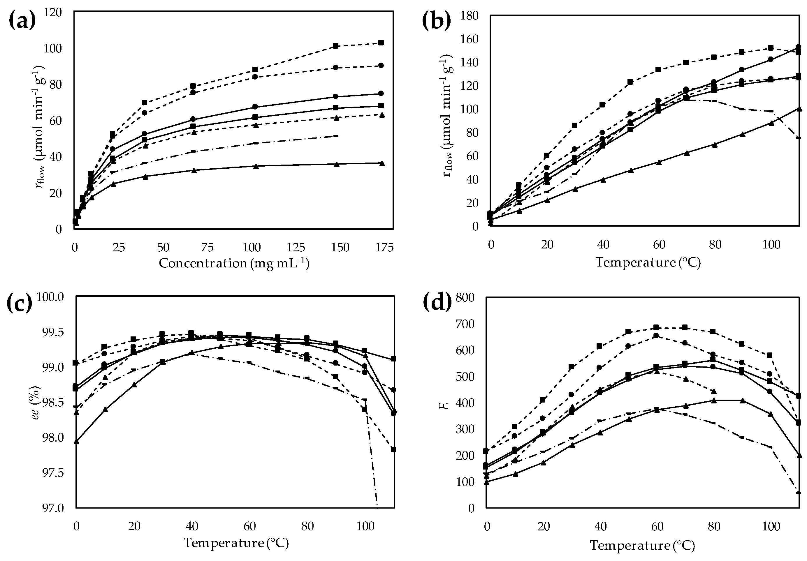 ). (a) Effect of the substrate concentration on specific reaction rate (rflow); (b) Effect of temperature on specific reaction rate (rflow); (c) Effect of temperature on enantiomeric excess (ee); (d) Effect of temperature on enantiomeric ratio (E).