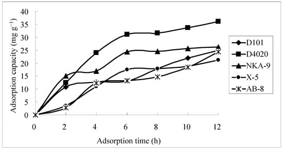 A 1.40 mg·mL−1 crude flavonoid extract solutionfrom Scorzonera austriaca was used as the test sample. Adsorption and desorption properties of five macroporous resins for total flavonoids were investigated. The results, shown in Table 1, indicated that among the five resins, the D4020 resin possessed a comparatively high adsorption capacity Qa (38.7 mg·g−1), desorption capacity Qd (34.8 mg·g−1) and desorption ratio (90.1%). The adsorption kinetics curves for total flavonoids on the five different resins were also obtained (Figure 1). From what can be seen in Figure 1, for all the five different resins, the adsorption capacity of total flavonoids increased with the adsorption time, increasing rapidly in the first 4 h and reaching equilibrium at about 6 h. For total flavonoids in the crude flavonoid extracts, all the five different resins have about the same rate of adsorption. In the comprehensive consideration of the adsorption capacity, desorption capacity, ratio of desorption and rate of adsorption, D4020 resin was fit to separate and purify total flavonoids from the crude flavonoid extracts, and in the following study, D4020 resin was chosen for further experiments.